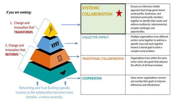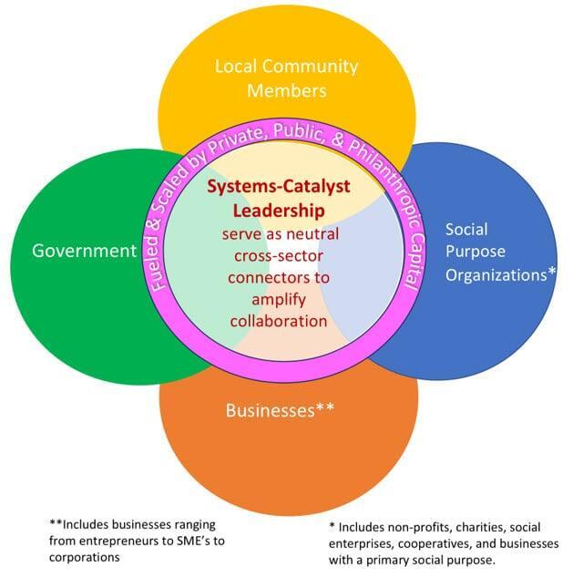 - local, neutral cross-sector connectors or systems-catalyst leadership is required to bring sectors together to ensure a whole-community or systems-approach to innovation and transformative change.